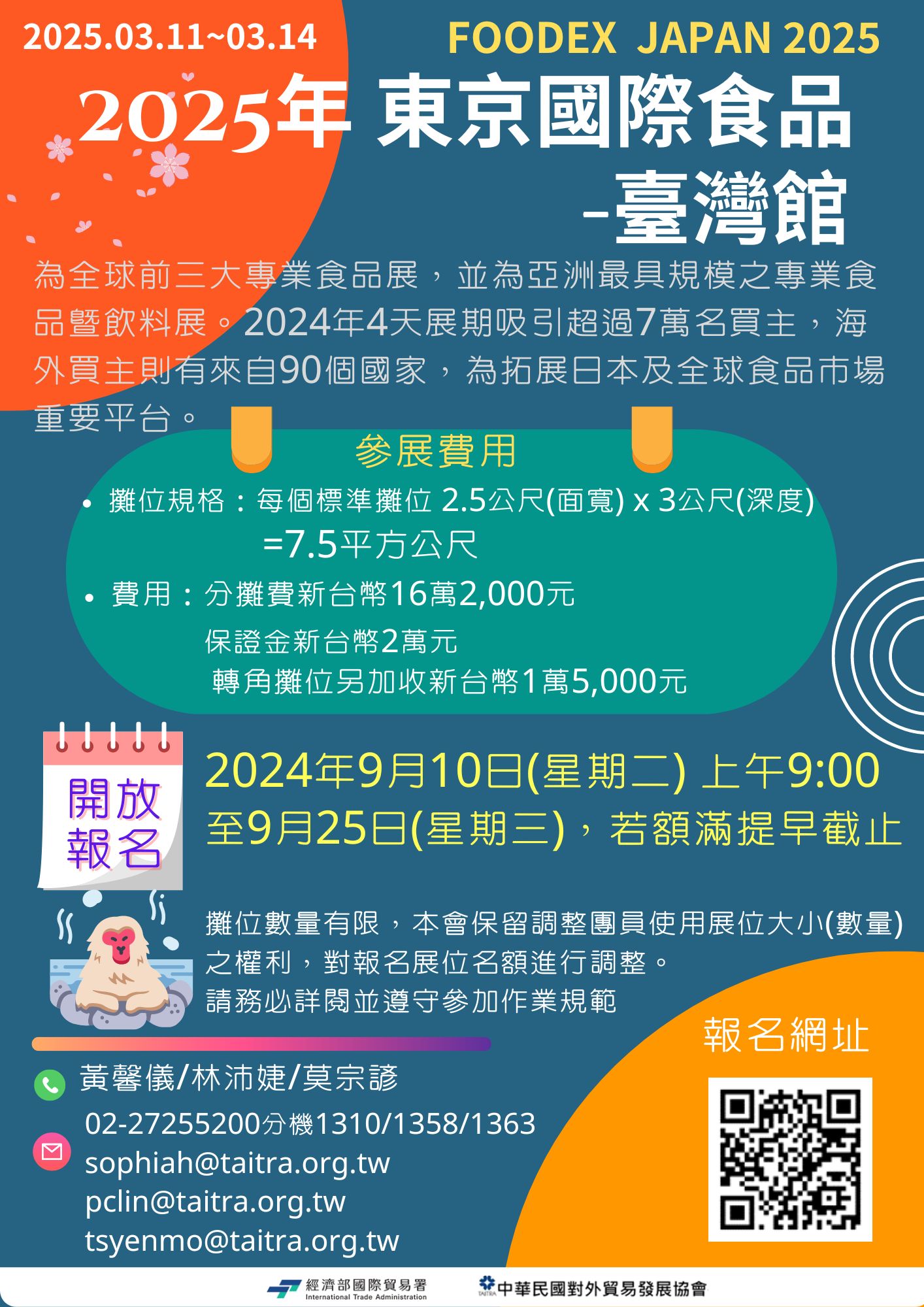 中華民國對外貿易發展協會9/10(二)上午9點開放報名2025年東京國際食品展臺灣館,